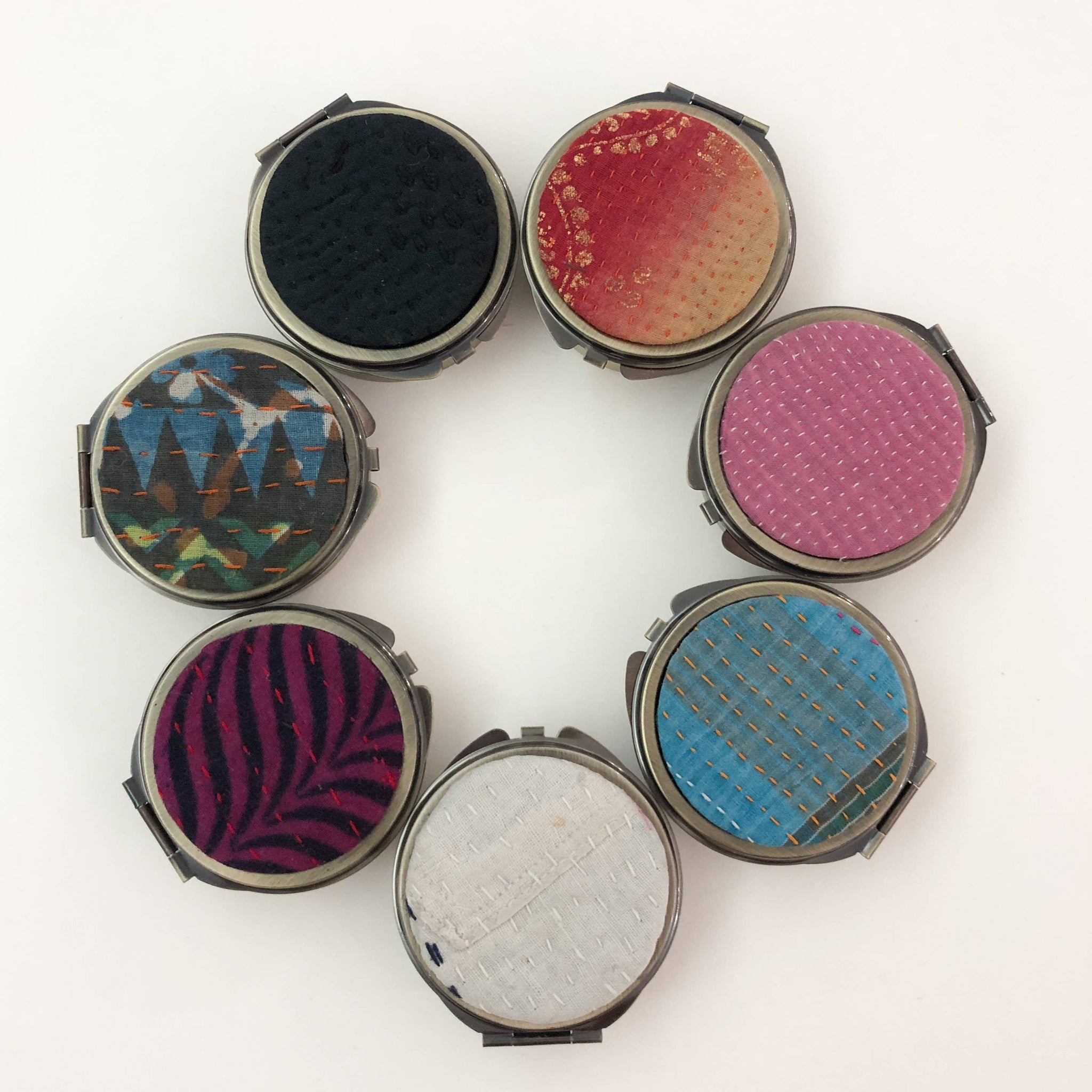 Elevate Your Organization! Introducing our versatile 3-Day Mirror Jewelry Pill Box Container – a perfect fusion of practicality and style. This compact container not only keeps your jewelry, or pills organized but also features a convenient mirror inside. With its innovative design, the compartment section can be easily detached, transforming this container into a single-day pill box. Crafted using Kantha scraps derived from our jacket production process, each detail reflects our commitment to sustainability. Measuring at 2.68 x 2.75 in., this Round Shaped Jewelry Pill Organizer is the perfect travel companion, fitting effortlessly into your bag or pocket. Embrace elegance and functionality with a touch of eco-consciousness. Experience the ultimate blend of convenience and sustainability with our Kantha Scrap 3-Day Mirror Jewelry Pill Box Container. Organize your jewelry or pills while making a positive impact on the environment – all in one elegant package. Photos are examples.