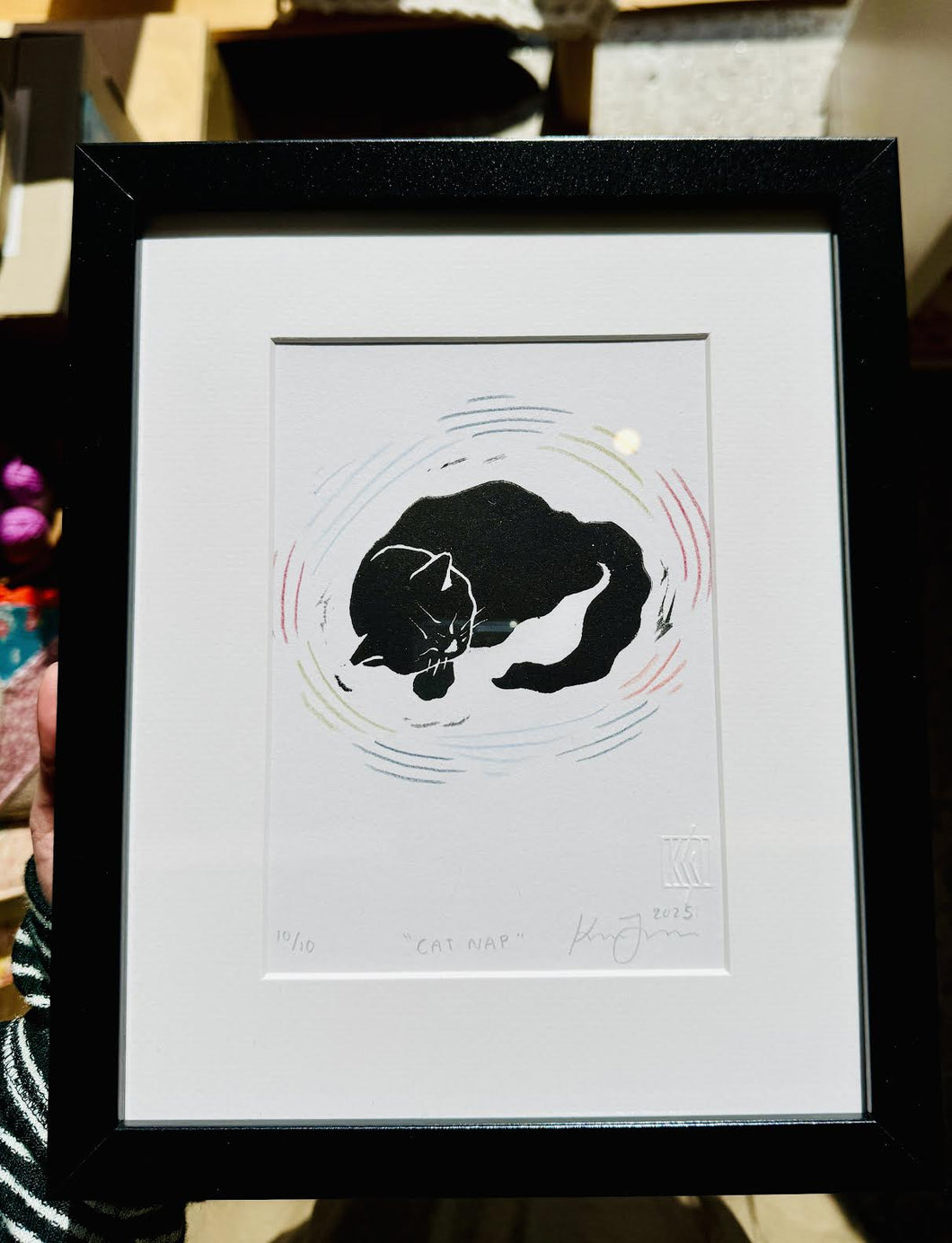 Variable edition of 10 linocut prints with hand-drawn colored pencil details. Each edition includes different colors and marks, so no one piece is the same. Signed, numbered, and embossed by the artist. 6" x 9" print in a 9" x 11" frame.