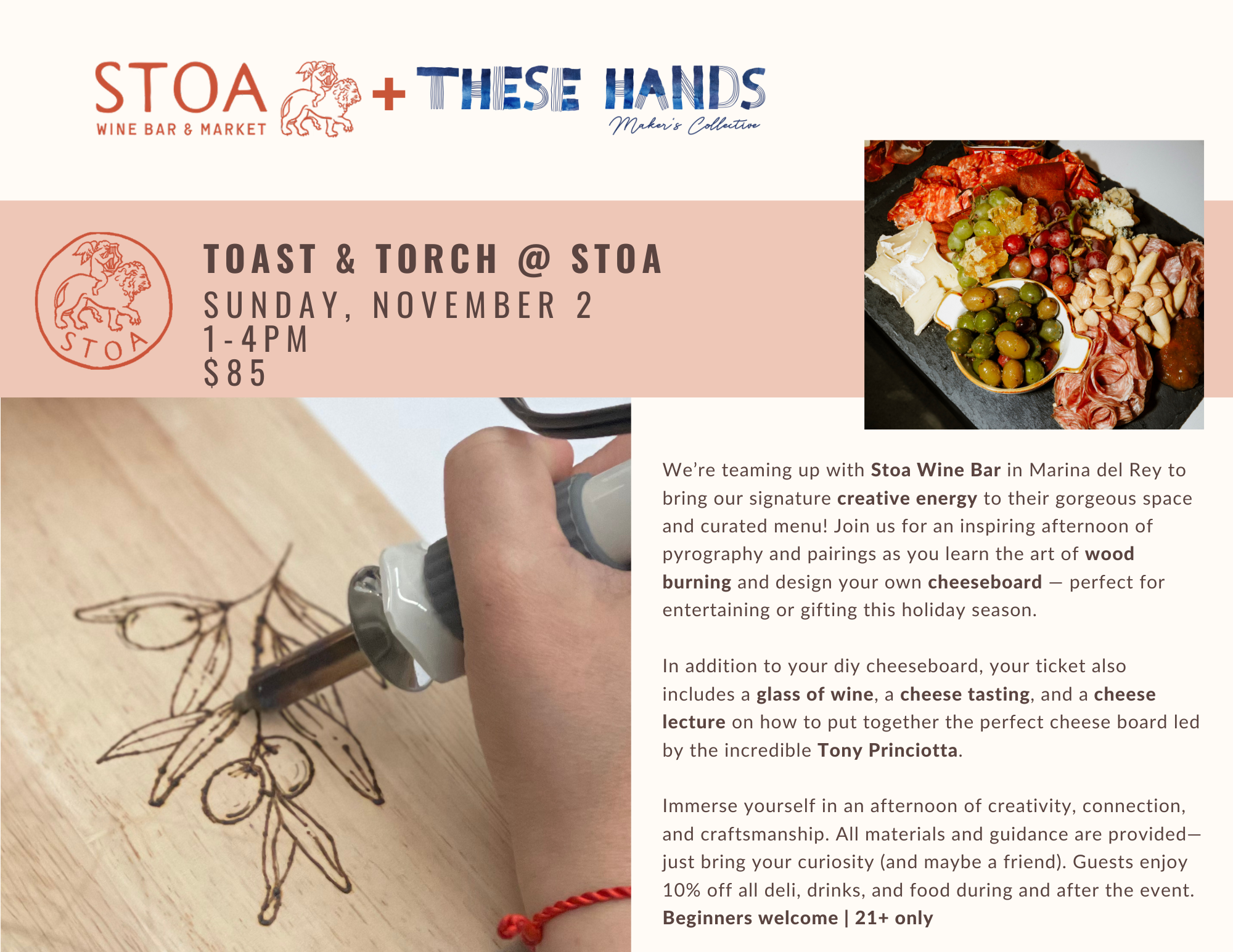 We’re teaming up with Stoa Wine Bar in Marina del Rey to bring our signature creative energy to their gorgeous space and curated menu! Join us for an inspiring afternoon of pyrography and pairings as you learn the art of wood burning and design your own cheeseboard — perfect for entertaining or gifting this holiday season.